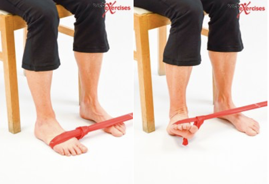 Ankle Eversion with Resistance Band: Bir sandalyede oturur pozisyonda başlayın. Direnç bandını ön ayak üzerine yerleştirin; bandın diğer ucu sabit ve hareket etmeyen bir noktaya sabitlenmiş olmalıdır. Dizler 90 derece açıyla bükülü olmalıdır. Diz kapağı ile ikinci parmak hizasını koruyarak, ayağın ön kısmını yerden kaldırın ve direnç bandına karşı dışa doğru kepçe benzeri bir hareket yapın. Yavaşça başlangıç pozisyonuna dönün ve ayağınızı yere değdirmeden tekrar edin. 3 set × 12 tekrar uygulayın.