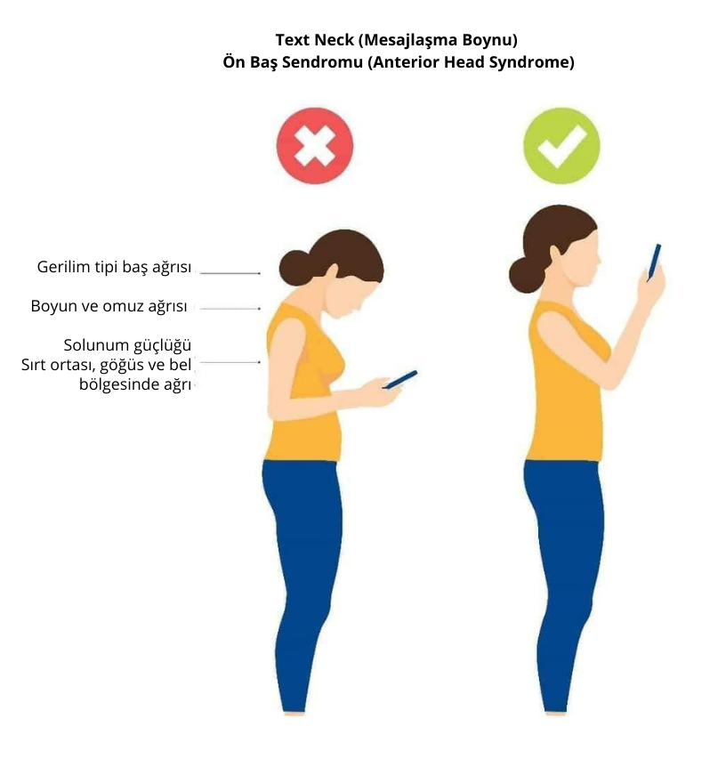 Cep telefonlarının yaygınlaşması iletişimi hızlandırmış olsa da, uzun süre telefona doğru eğilerek bakmak FHP’yi belirginleştirebilir ve boyun ağrısının ortaya çıkmasına katkıda bulunabilir (Damasceno vd., 2018; Gustafsson vd., 2017).