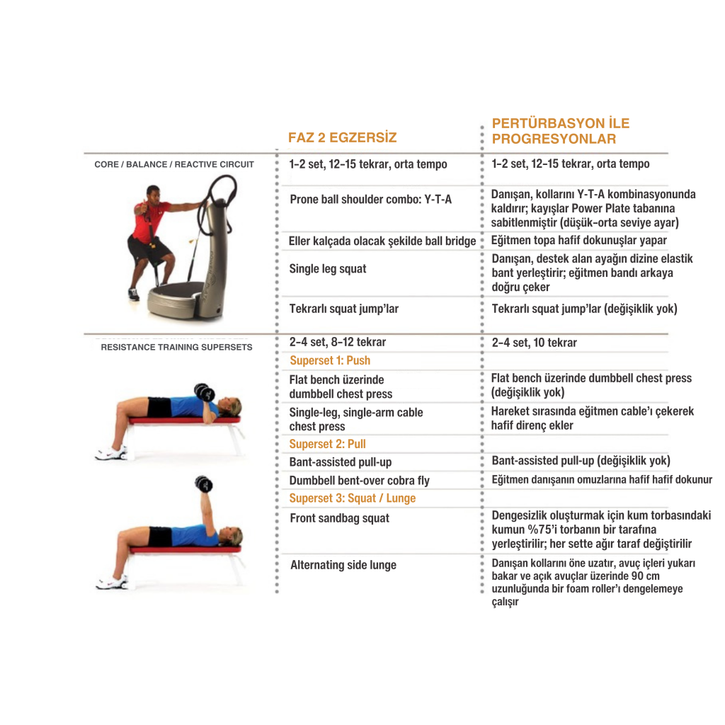 Danışanlar kondisyon düzeyleri ilerledikçe ve belirli bir pertürbasyon düzeyini kontrol edebilme ya da karşılayabilme becerisi geliştirdikçe, uygulamaların değişkenliği ve yoğunluğu kademeli olarak artırılabilir. Bu ilerleme; daha kuvvetli top temasları (Faz 2 örnek programda belirtildiği gibi), daha uzun süreli izometrik tutuşlar, farklı yönlerden uygulanan kuvvetler ve tek bir set içinde çok açılı pertürbasyon uygulamalarıyla sağlanabilir.