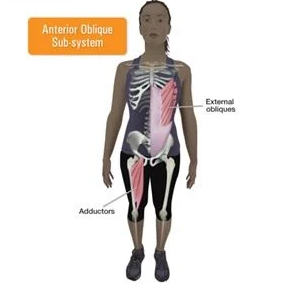 Anterior oblik alt sistem internal oblique, external oblique, adductor complex ve kalça dış rotatörlerinden oluşur (Şekil 4). Posterior oblik alt sistemde olduğu gibi bu sistem de transvers düzlemde çalışır; ancak etkisini vücudun ön kısmı üzerinden gösterir.