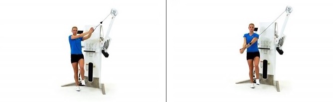 Single-leg Cable Chop egzersizi (Şekil 8), anterior oblik alt sistemi geliştirmeye yönelik etkili bir uygulamadır. Bu egzersiz, gövdede transvers düzlem hareketi oluştururken aynı anda kalça dış rotatörleri (gluteus maximus ve gluteus medius) ile addüktor kas gruplarının birlikte aktive edilmesini sağlar.