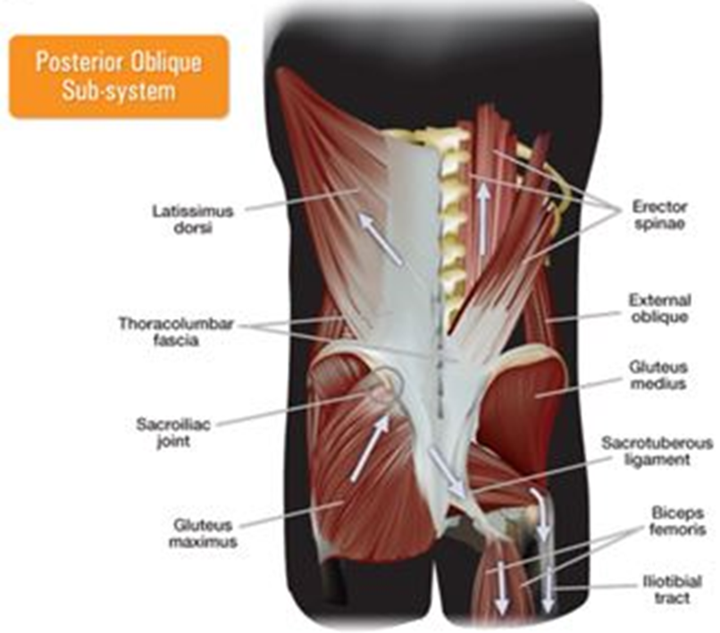 Posterior oblik alt sistem gluteus maximus, latissimus dorsi ve thoracolumbar fascia yapılarını içerir (Şekil 3). Bu alt sistem, özellikle rotasyonel hareketler sırasında ortaya çıkan transvers düzlem kuvvetlerini dağıtarak derin boylamsal alt sistem ile sinerjik şekilde çalışır.