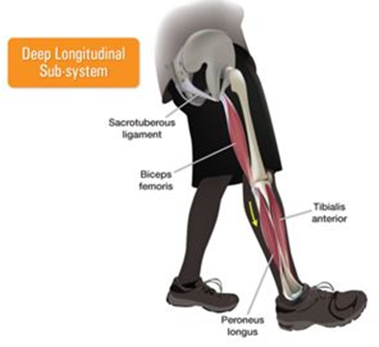 Derin boylamsal alt sistem erector spinae, thoracolumbar fascia, sacrotuberous ligament ve biceps femoristen oluşur (Şekil 2). Bu alt sistem, yerden yukarıya vücudun stabilitesini sağlayan temel yapılardan biridir. Daha spesifik olarak, ayak ve ayak bileğinden başlayarak gövdeye iletilen kuvvetlerin dikey eksen boyunca aktarılmasını ve bu kuvvetlerin kontrollü biçimde yeniden aşağı yönlendirilmesini sağlar.